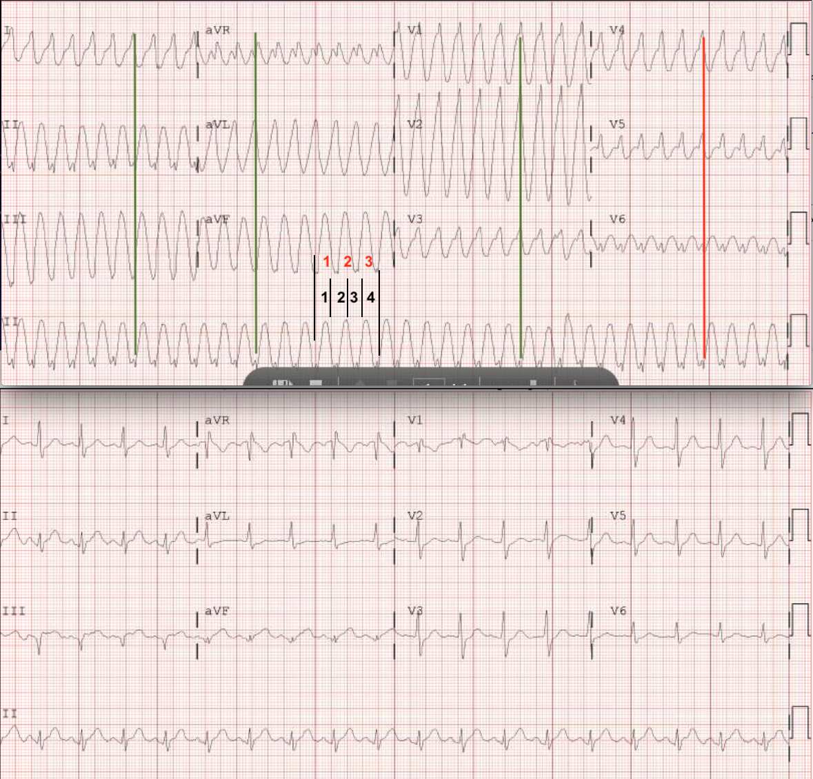 > Nótese que adjunte el ECG de 12 derivaciones post conversión en la parte de abajo de la Figura-1. Será que el parecido a lo que sugerí arriba con el QRS angosto del trazo post conversión tal vez refleje un QRS angosto durante la taquicardia (lineas verticales ROJAS y VERDES)?